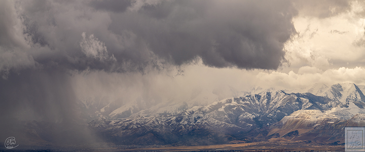 Sunlight broke through the storm highlighting the Salt Lake Valley's western Oquirrh (Oak-er) Mountains. Dynamic weather was occurring all over the valley on November 9, 2022. In some areas the sun was shining, in other places it was snowing, creating compelling compositions. On the right is an area of the mountain range where the Rio Tinto mine is located. Covered in snow it looks like some strange, futuristic city. It was an incredible day to be outside photographing and observing nature’s grace. The name Oquirrh is actually a Goshute Indian word that means Wooded Mountain. The range consists of a string of 10,000 foot peaks that run north to south for nearly 30 miles. Photographer Elizabeth Miklavcic, nine-frame exposure bracketed panorama.